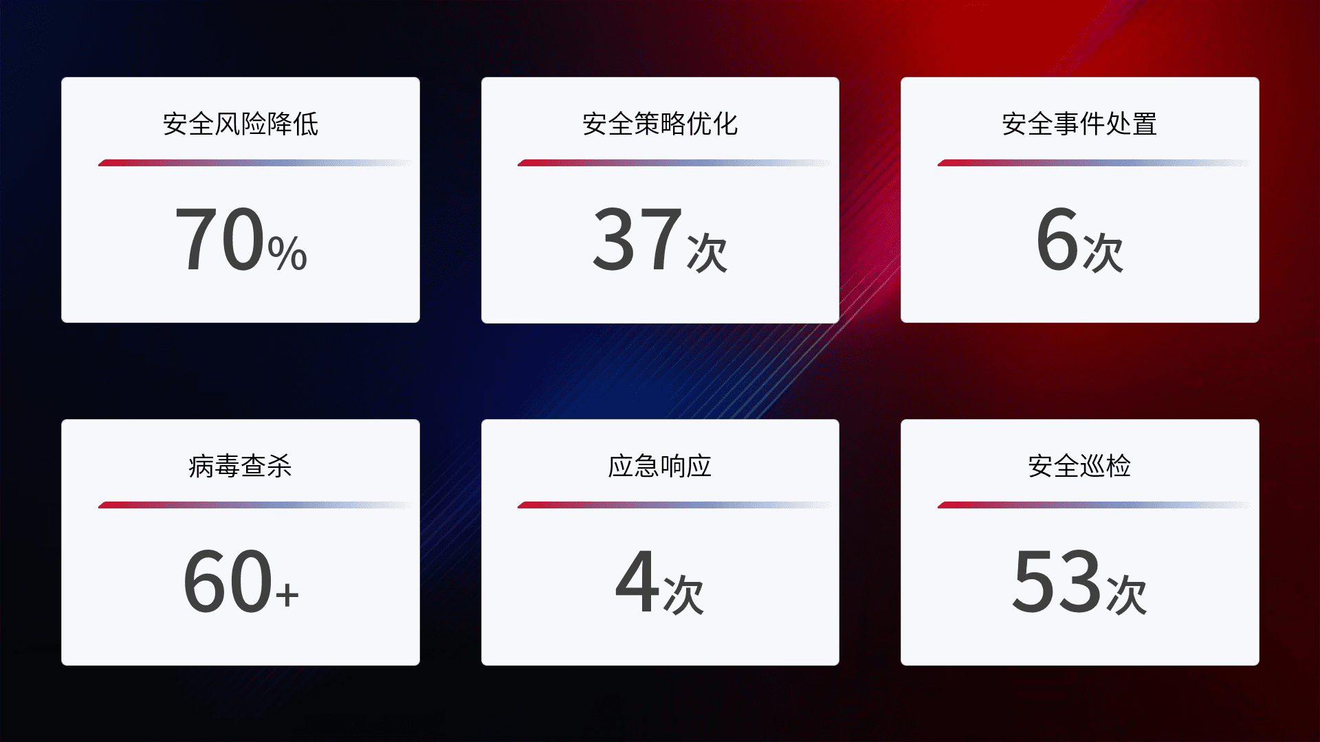 提供全面的安全事件报告体系,,,包括处置报告、、周报、、、、季度和年度总结,,,结合持续监控,,,帮助客户深入了解网络安全状况。。