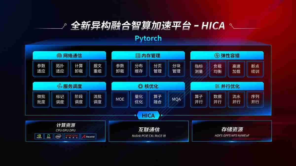 通过自研的服务层、、、、中间适配层、、以及调度编排算法,,,采用数据并行、、、模型并行等多种并行方式,,,,把并行计算任务进行有效的分解,,使其分别由相应的软件栈和算力资源来承接。。。当GPU资源变化,,HICA可以实时动态调度计算子任务并调整模型拓扑和架构,,,,以充分聚合各种算力资源。。。。